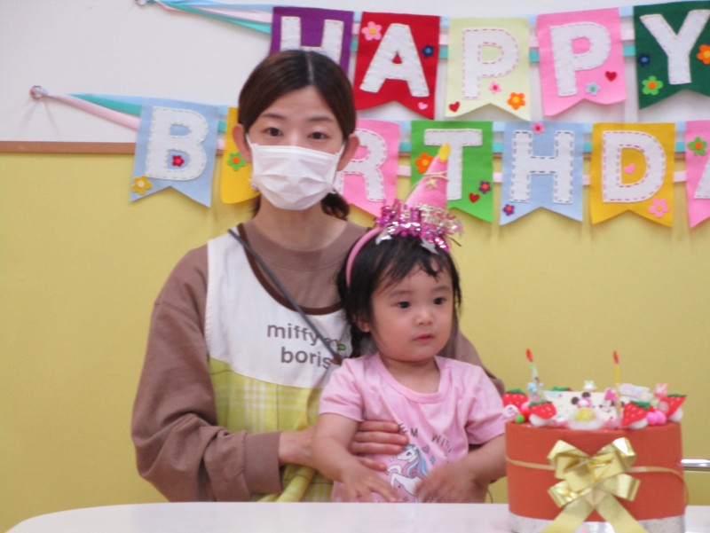 イベント 日付:2024.03.28 2月のお誕生会🎂 大変遅くなりました。2月生まれのお友達のお誕生会の様子です。 ちょっぴり緊張気味です。 大好きな担任の先生に抱っこしてもらって、少し緊張もほぐれたかな? 先生達から、可愛い風船のプレゼントもあり、みんなも大喜び! そして、おやつの時間には、調理員さんが作ってくれた大きなケーキを前にニッコリ! お誕生日おめでとう!笑顔あふれる一年になりますように。