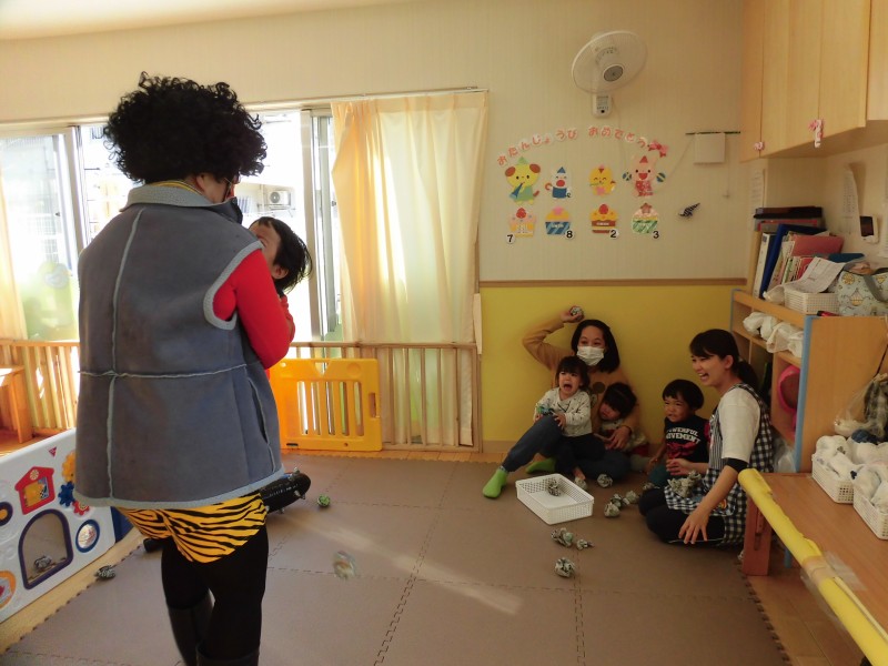 1月生まれの誕生会を行いました。🍰HappyBirthday💐ゲストに「おきなわの紙芝居屋さどやん」が来てくれましたよ。数の数え方や、あいさつ等の簡単な方言を教えてくれました。紙芝居「クスクェーの話」では、独特のイラストに目を奪われる子ども達の姿がありました。最後は皆で方言ダンスをして「ゆがふたぼーり(幸せが訪れますように!)」の素敵なあいさつを教えてもらいました。ご家庭でも、朝や食事前、お礼など簡単なウチナーグチで行うのも良いかもしれませんね。