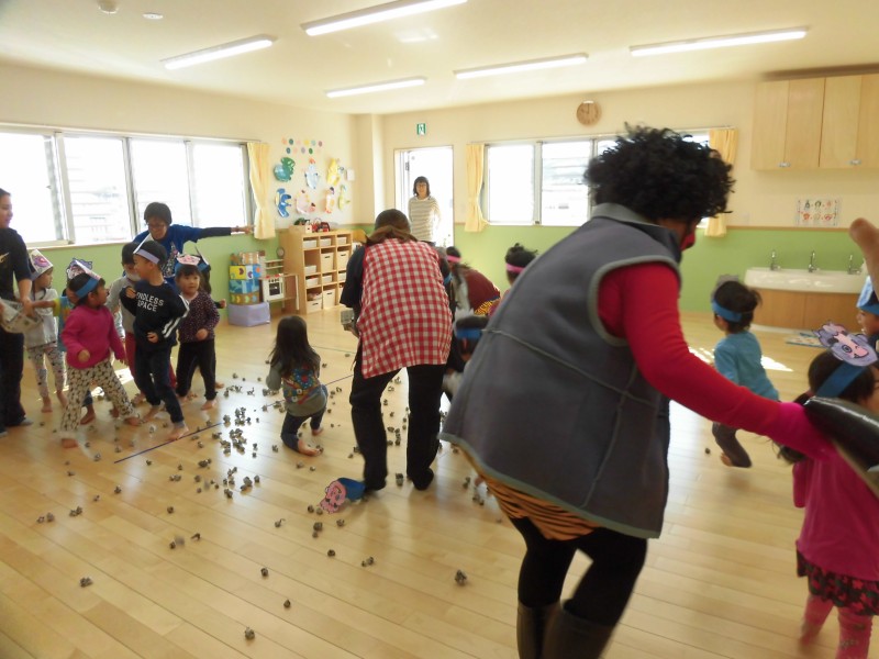2月3日節分!👹赤と青のゲスト…そうです、鬼さんです!が遊びに来てくれました。園児たちも、初節分に泣きわめきながらも、「鬼は外~‼」と新聞紙豆を投げて鬼を追い払ってました。それぞれの心の中の、泣き虫鬼、いやだいやだ鬼、野菜嫌い鬼、いじわる鬼を追い払うことができたのではないでしょうか。そのあと、福の神からお菓子をもらい、幸福ももらいました。