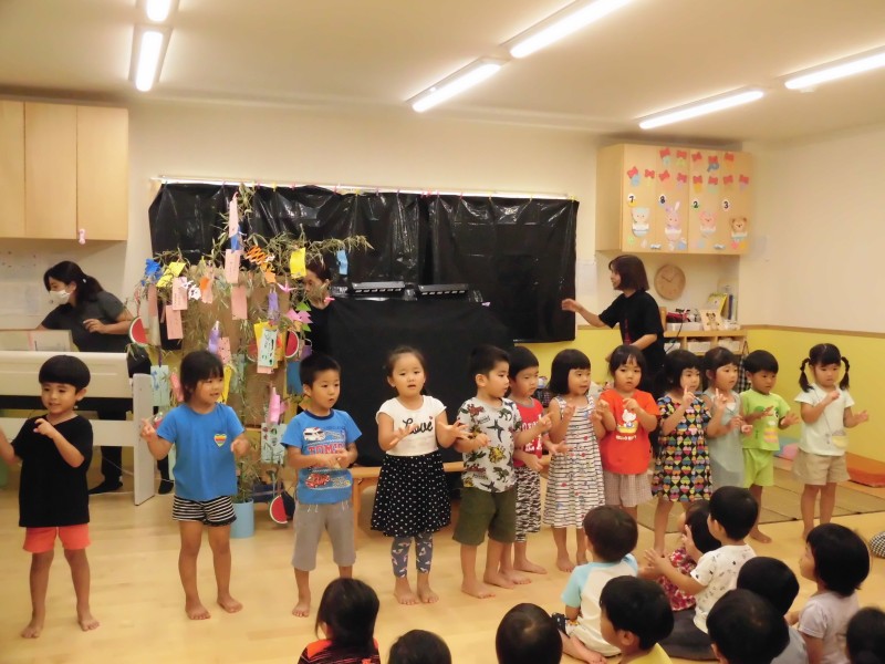 🎋7月7日に七夕集会を行いました🌟願い事を短冊に書き、各クラス代表がお願い事を発表しました。家に帰って、夜空のお星さまにお祈りした子ども達も多かったようです。七夕の由来のパネルシアターも、ブラックライトで光り神秘的でした。今年も、笹を寄付してくださった仲門家様ありがとうございました。