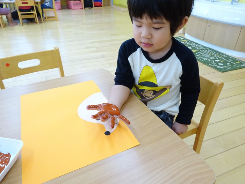 その他 日付:2021.11.25 りす組 今月の製作🦔 11月の製作は、茶色の絵の具を手に塗って、画用紙に手形をおしてハリネズミのはりをイメージして製作しました🦔 手に絵の具を塗るのを「くすぐったい」と喜ぶ子どもや少し嫌がる様子が見られた子もいました😂 ペタペタ張り付けるのも楽しんでいましたよ😊😍 送迎時の際に是非、見てみてください😊💚✨