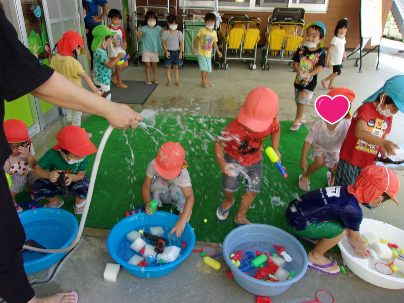 毎日火曜日は待ちに待った水遊びの日。水鉄砲、魚すくい、スポンジ遊びなど皆それぞれ自由に大好きな水遊びを楽しんでいます。最近ぱんだ組で流行ってるのが先生への集中攻撃水かけなんです。なぜかこの時だけは団結力があって、皆目を輝かせて先生への攻撃をめっちゃ楽しんでますよ。