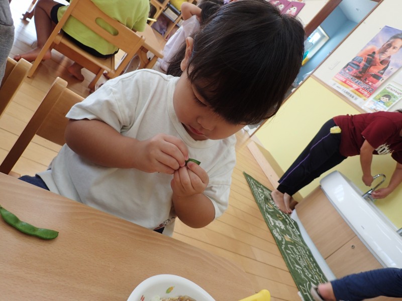 皆、興味津々で保育士のやり方を見る!実際に体験してみると、上手く搾れる子、力があまり入らずなかなか出てこない子がいたが、皆楽しく体験していました![]()