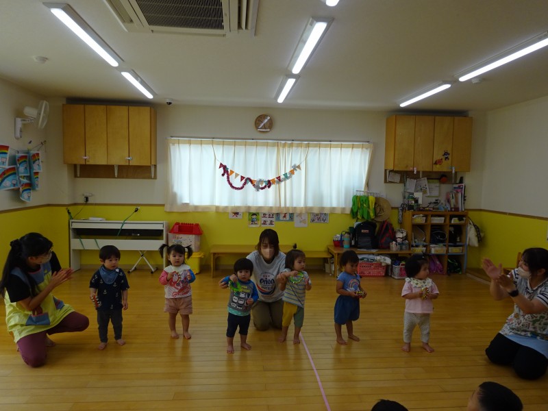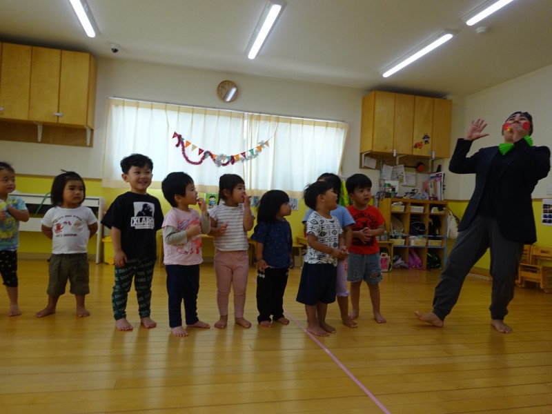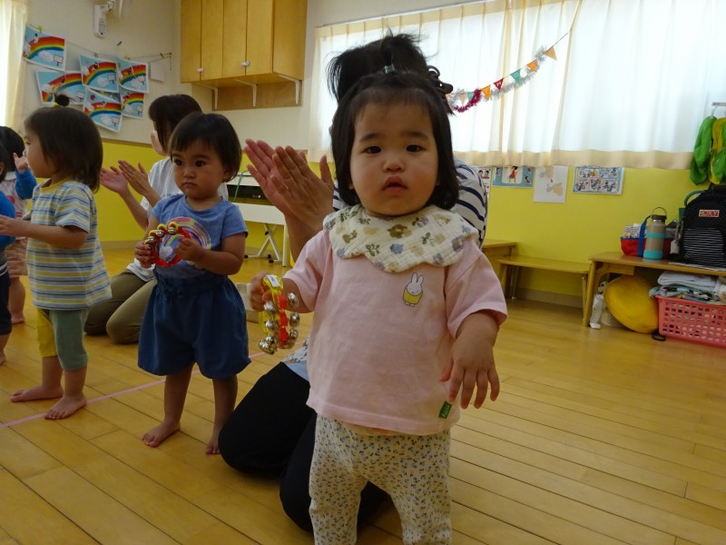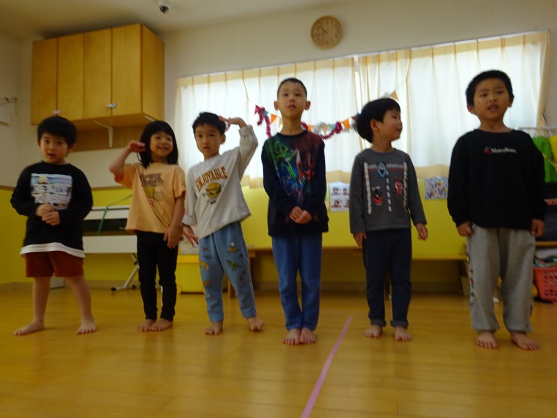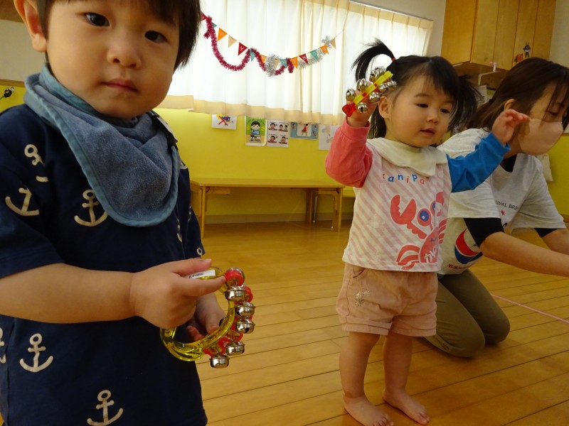 今月は今年度最後の誕生会ということで、各クラスからの余興を楽しみました🎵はじめは可愛いひよこ組さん🐣みんなで並び小さな手で鈴を持ち、おもちゃのチャチャチャの音楽に合わせて演奏してくれました🎵