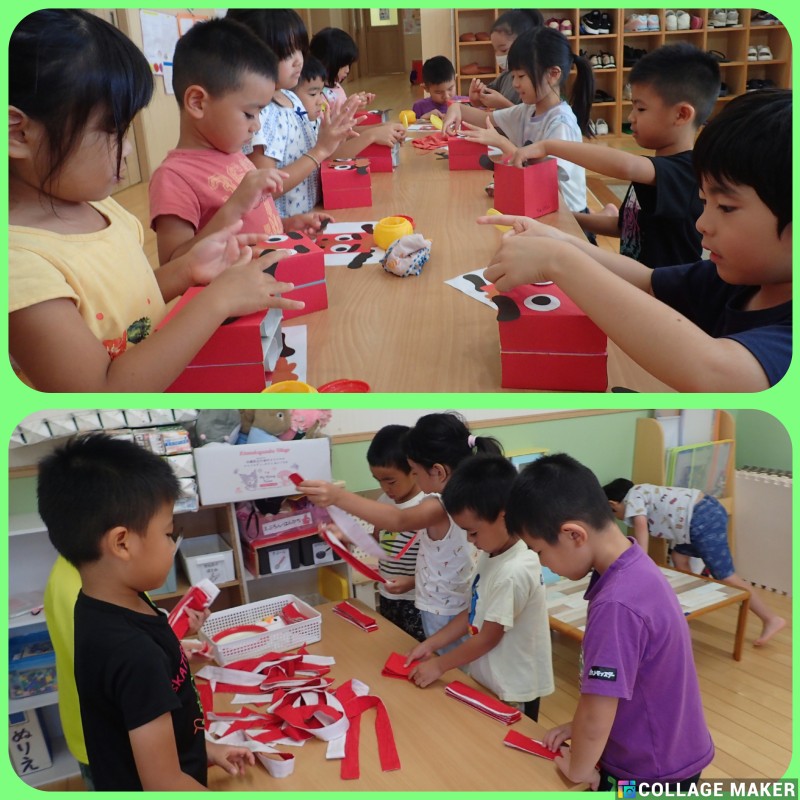 運動会前には練習で使うはちまき畳むのを手伝ってくれたり、みんなで獅子舞作りもしました⭐見本を見ながら作った獅子舞はみんな違う顔で個性あふれるものが作れましたよ!