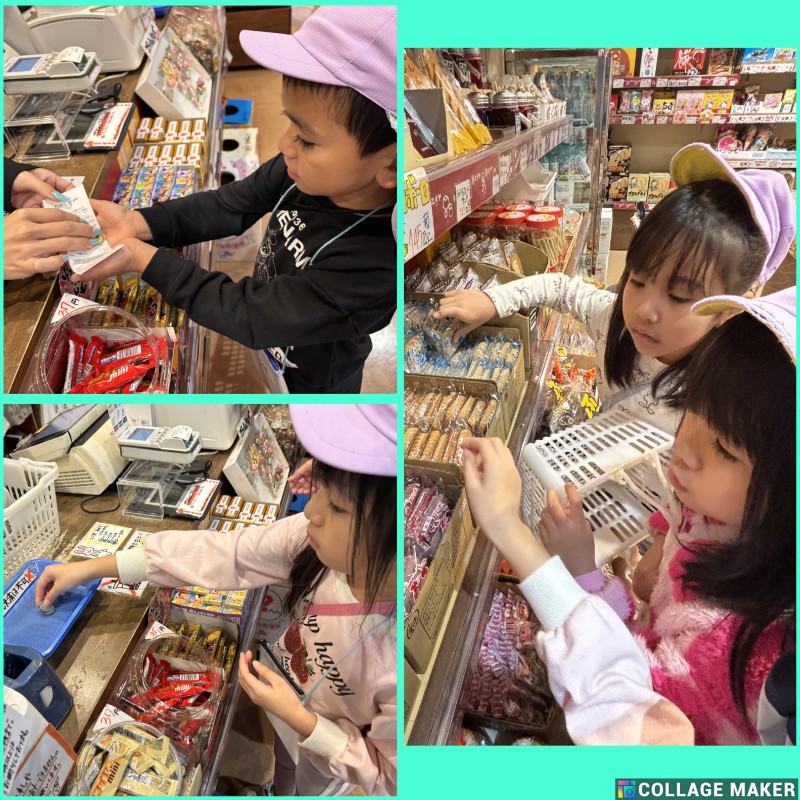 初めてのお買い物体験🛒お小遣いをもらい、ライカムの駄菓子屋さんにお買い物体験に行きました!お友達と一緒に「あれ一緒に買おう」「どれにする?」と楽しそうにお菓子を選んでいましたよ![]()