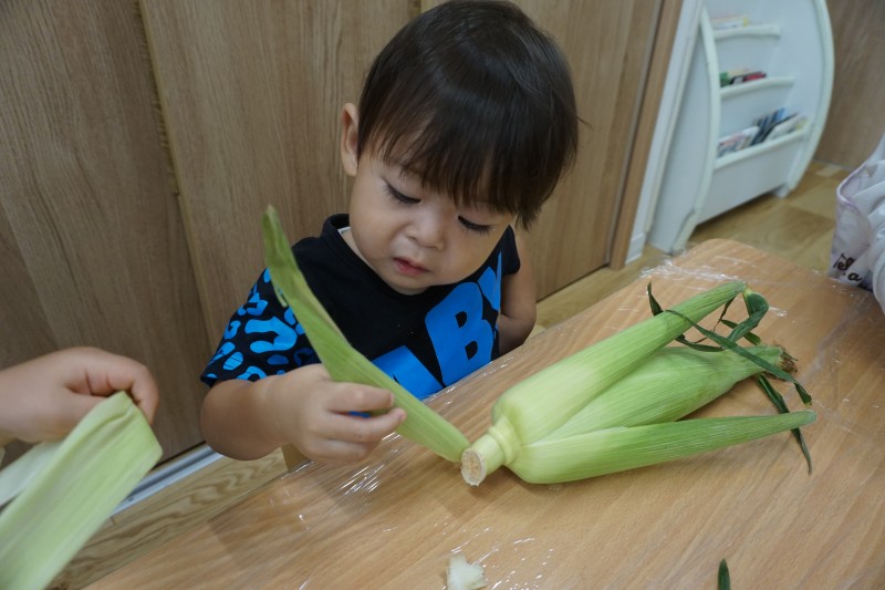 みんなと一緒にとうもろこしの皮むきができ、嬉しそうな子どもたちでした![]()