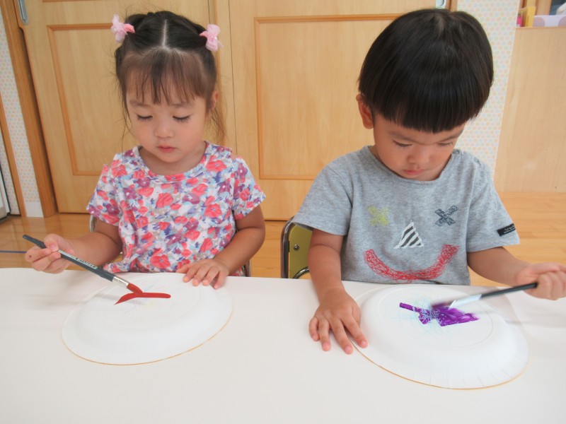 紙皿に、クレヨンでお絵描きをした後で、絵の具でぬりぬり。。
