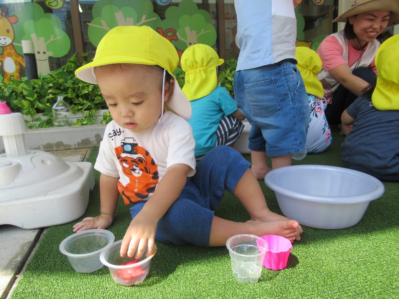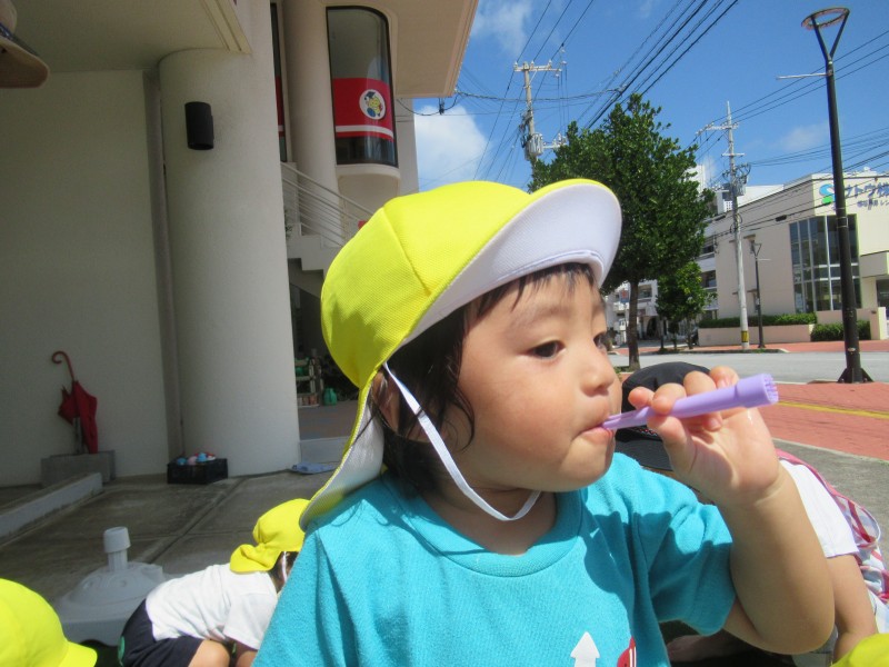 その他 日付:2020.08.21 🌴軒下遊び🌴~りす組~ りす組さん、軒下で魚釣り遊びをしました!🐠 少しだけ水を入れて、涼しさも味わいながら…。 シャボン玉も少しずつ吹けるようになっています🎈 釣った魚をパクン!と食べようとしたり、😊 「かさな!」とこの時期だけ特別の言い間違いを聞かせてくれたり、💗 容器に一つずつ入れて、先生達に配ってくれたり…✨ 途中で、ピーポーピーポーと遠くから音が聞こえてくると、 「あ!!」「きゅーきゅーしゃ!?」とソワソワ。。 あっちから来るよ~と伝えると、じーっと集中。 通り過ぎていく働く車を嬉しそうに見ていました🚑