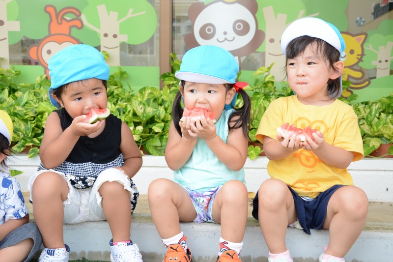 イベント 日付:2020.08.29 🍉スイカ割り🍉 真志喜園、夏の恒例行事。 今年もスイカ割りを敢行することが出来ました!!🍉✨ 台風と台風の狭間、一度は延期しましたが、夏のうちに出来て良かった~!! 先生のクイズや絵本の後、まずはひよこ組さんのデモンストレーション💗 スイカとひよこ組さんの組み合わせには、毎年保育士一同からトキメキの声が上がります😊 外は暑いので、ひよこ組さんはここでお部屋に撤退~♪ 続いて、本番です!!🍉 りす組さん、うさぎ組さん、気合を入れて挑みました!!🎶 さ~て、割れてきましたよ~~!!🍉✨ ついに、その時が。。 うさぎ組さんの最後の一撃で、見事スイカは真っ二つに!!😊 子ども達、大喜びで食べていましたよ💕 スイカは、沖縄で有名な今帰仁(なきじん)スイカです🍉 農家さん、美味しいスイカをありがとうございました~!!😊