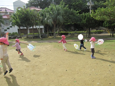 その他 日付:2021.01.13 🎍凧あげ🎍~うさぎ組~ 久しぶりにすっきりと晴れましたね~!!☀ お天気が良い日は、子ども達も嬉しいのかなんだか朝からご機嫌な子が多かったです🎶 先日、何やら製作をしていたうさぎ組さん。 ビニール袋にマジックでお絵描き。 何が出来上がるのかな??? 今日、完成した作品を持って公園に行きました!!✨ そう、作ったのはお正月遊びの『凧』でした😊 風を切って目一杯走り、凧が高く上がりましたよ~~!! 最後はみんなで記念撮影。 まだまだと思っていたうさぎ組さんの卒園も、3ヶ月後になりましたね🌸 卒園まで、みんなで仲良く、たくさん遊ぼうね!💗