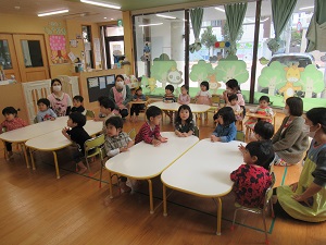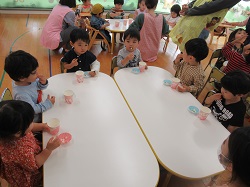 絵本をみた後は皆でひなあられとカルピスで