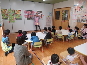 子ども達が作ったひな祭り製作を保育者が紹介すると