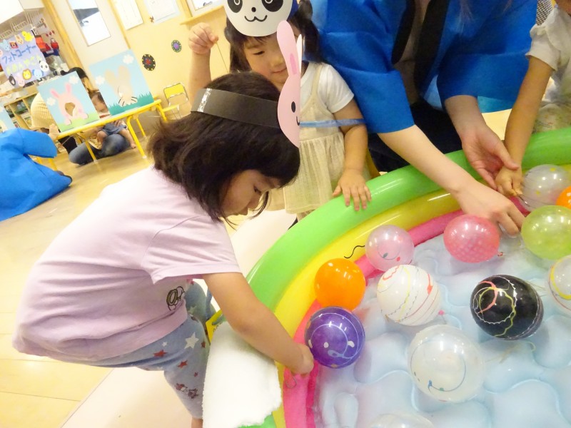 うさぎさんは、お玉かS字フック、好きな方を選んでヨーヨーすくいに挑戦します!!