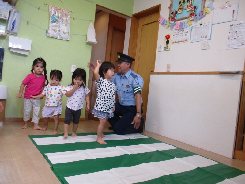 子どもたちは質問に対し、信号の色を見て「みどり」「あか」と元気に答えていました