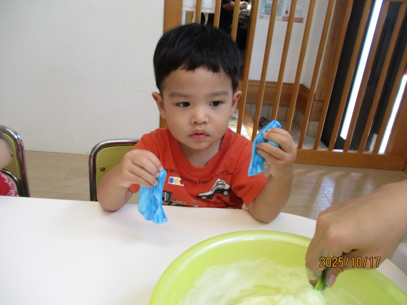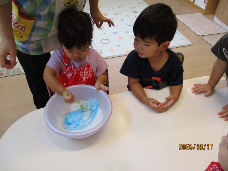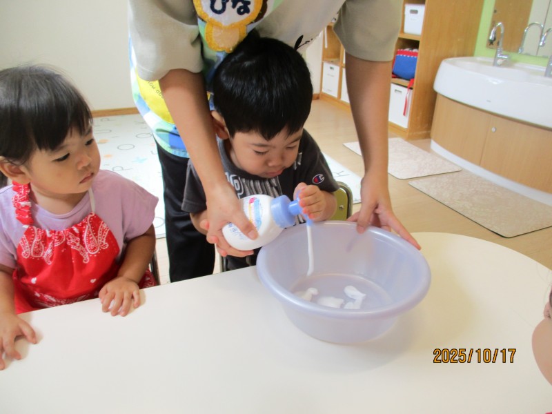 洗濯のりと泡石鹸、ホウ砂水等を入れ混ぜて作りました