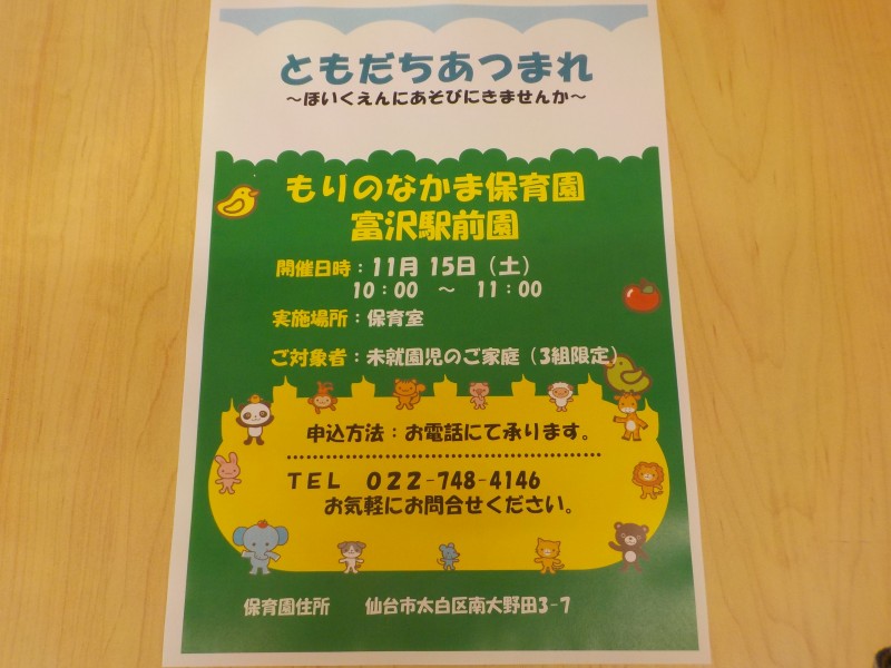 日時:11月15日(土)10時から もりのなかま保育園富沢駅前園 0歳児保育室にて