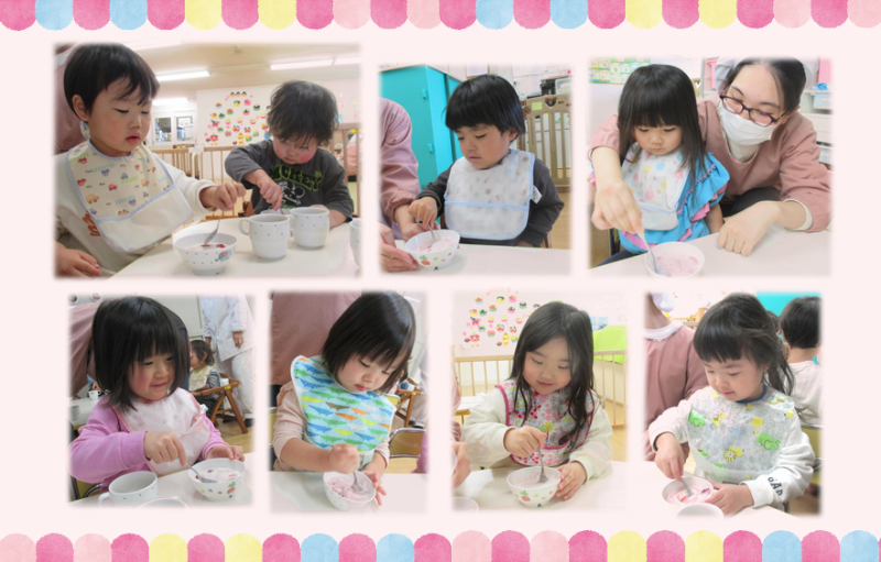 2歳児クラスさんは特に混ぜるのが上手で
