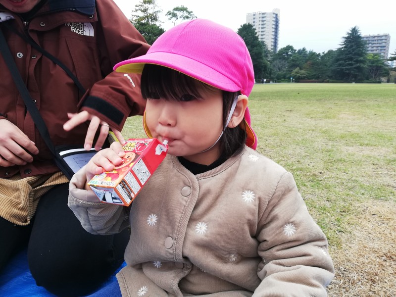 公園では最初に芝生広場でおやつを食べました🎵大好きなアンパンマンジュースを見て