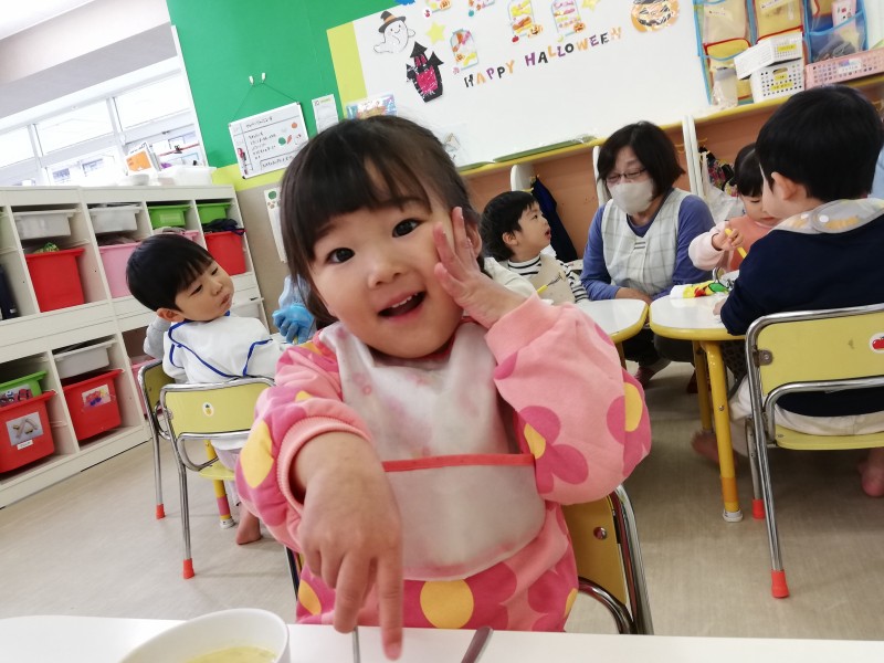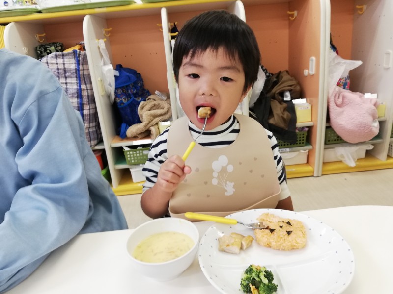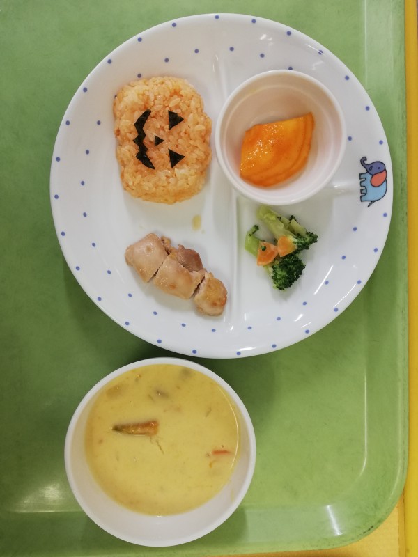 給食では、ハロウィンメニューで可愛いジャックオーランタンのチキンライスが出ました👻