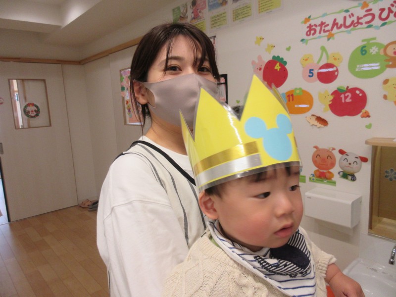 初めてのお誕生会ですが、王冠も嫌がらずに被ってくれました。みんなの前に座っても泣かずに、いつもの笑顔を見せてくれました。