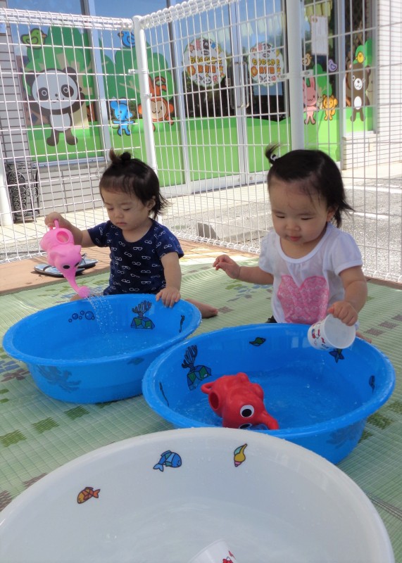 0歳児ことり組は、手足でちゃぷちゃぷと可愛い水遊び。💦