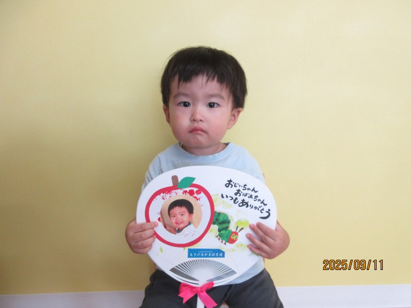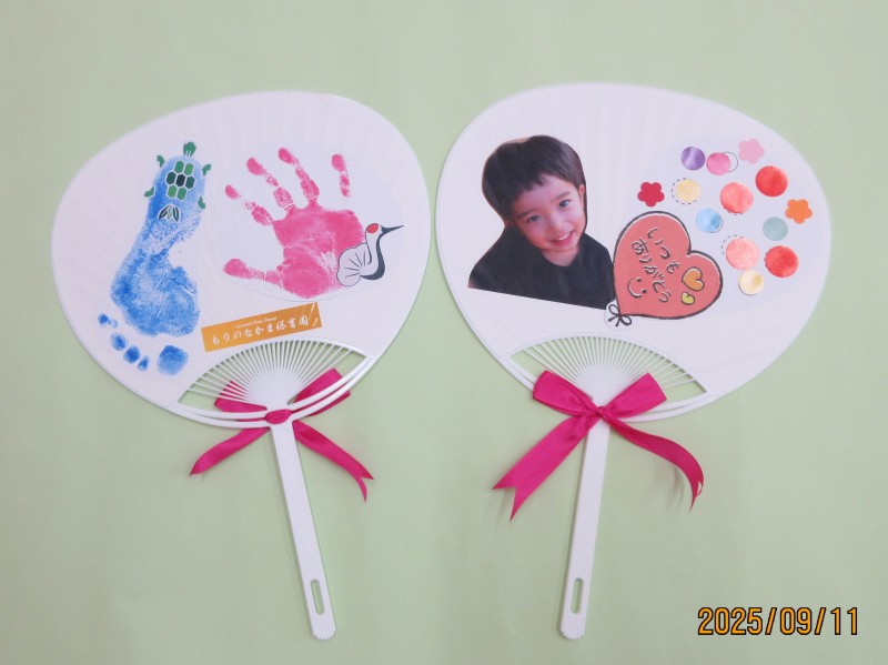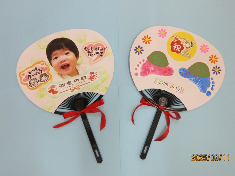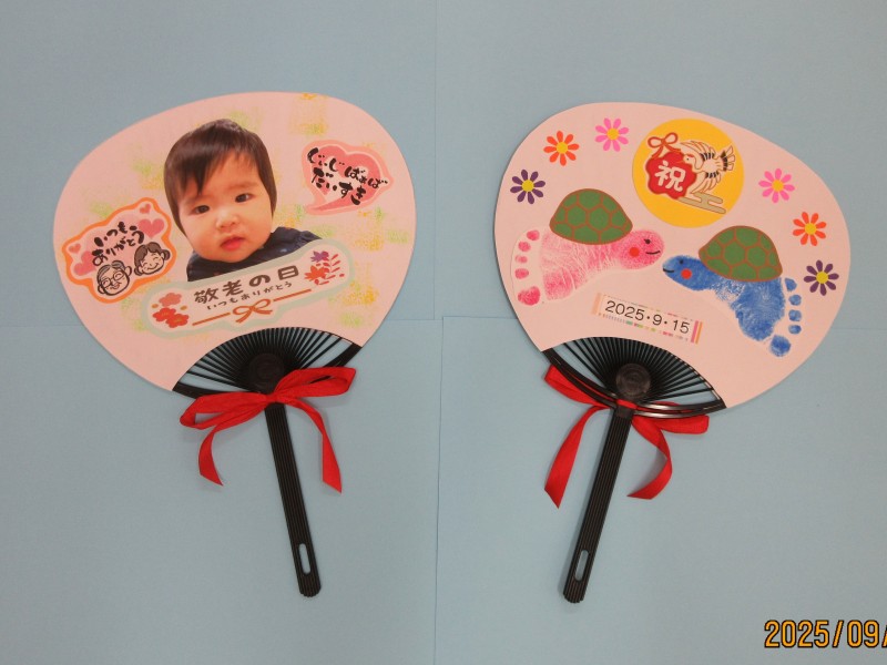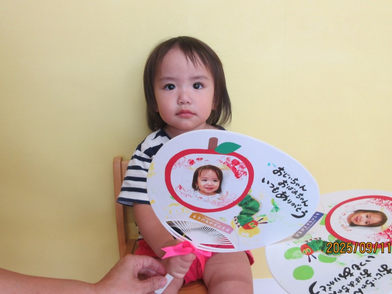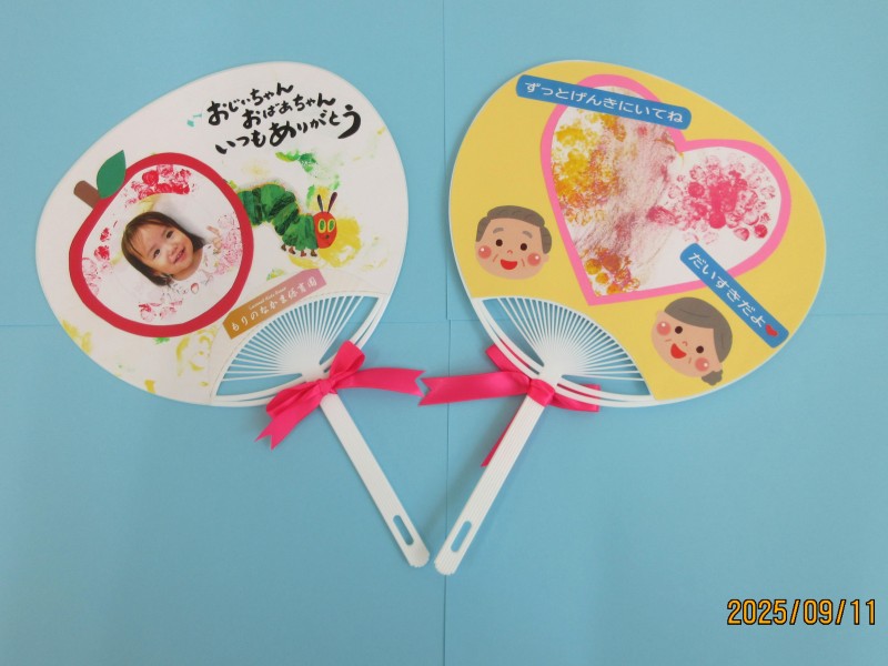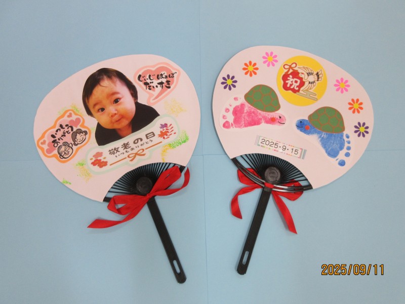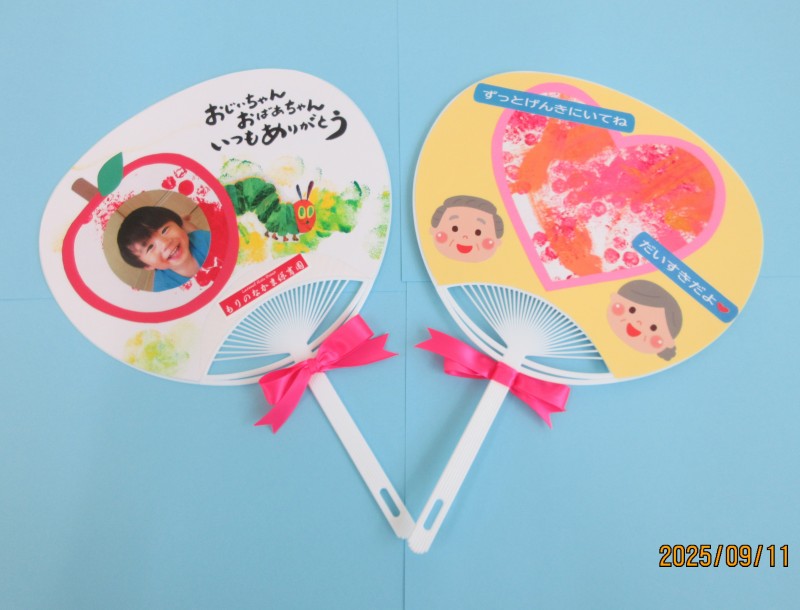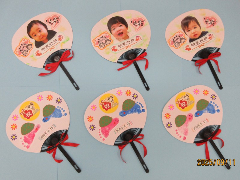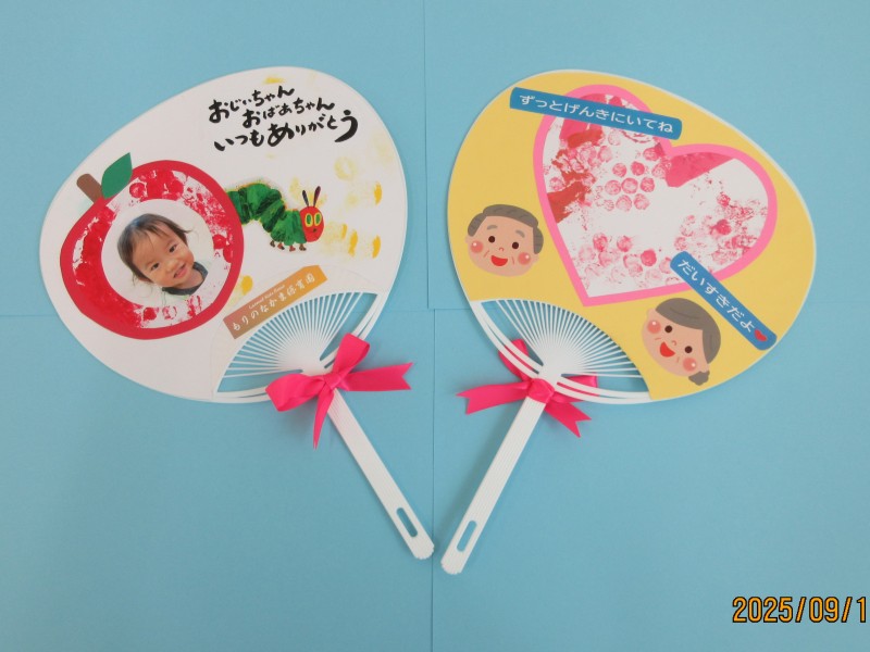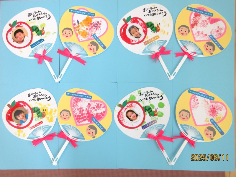 その他 日付:2025.09.16 👴👵おじいちゃんおばあちゃんいつもありがとう💕 おじいちゃんとおばあちゃんに「ありがとう!」を贈りました。🎁 0歳児ことり組。足形の亀さんが可愛いね。🐢 1歳児りす組。りんごの窓から可愛い笑顔が見えますよ。🍎 2歳児うさぎ組。素敵な花束も作ったよ。飾ってね。💐 👴👵いつも優しいおじいちゃんおばあちゃんが大好きな子ども達が、 「ありがとう!」を伝えたくて団扇を作りました。🎁 👦👧👶お孫さんの作品を飾って、癒されてくださいね。💕