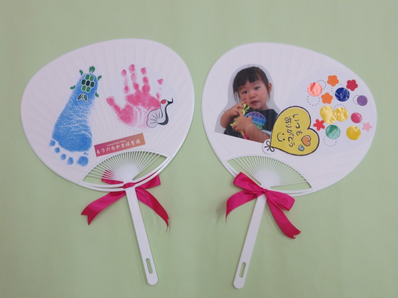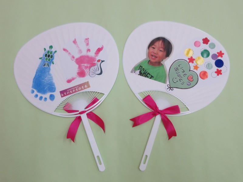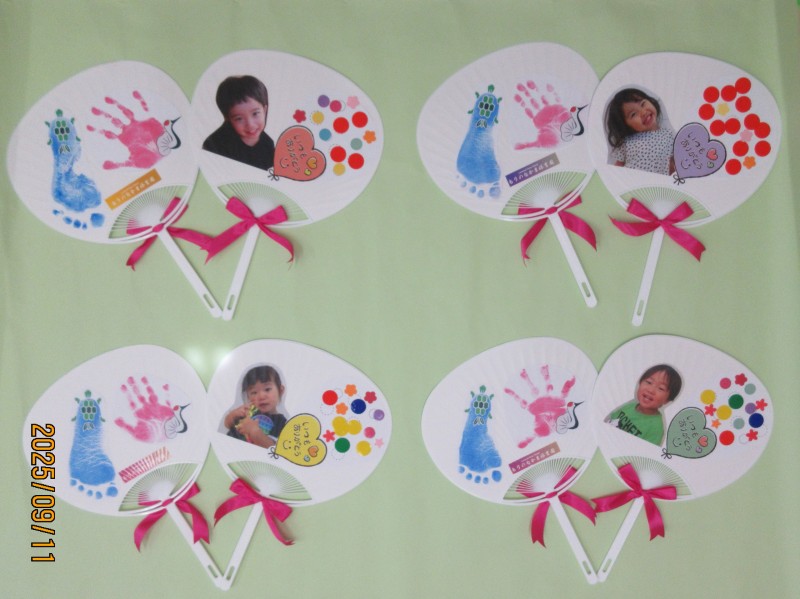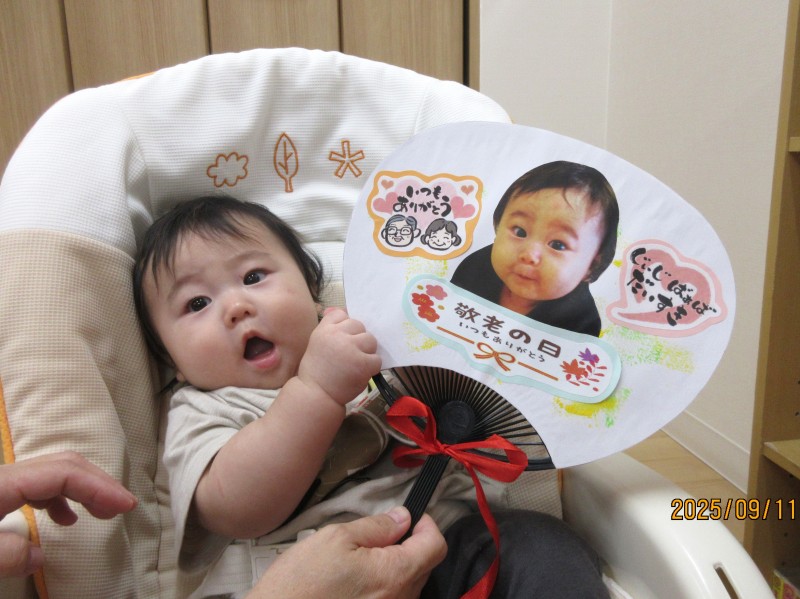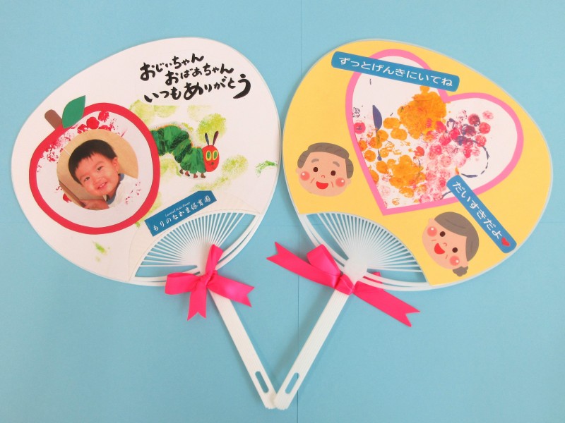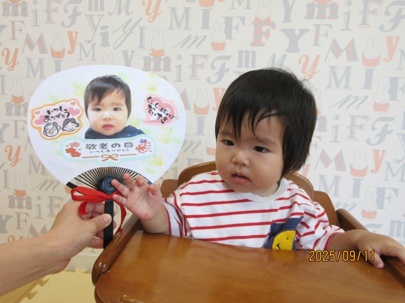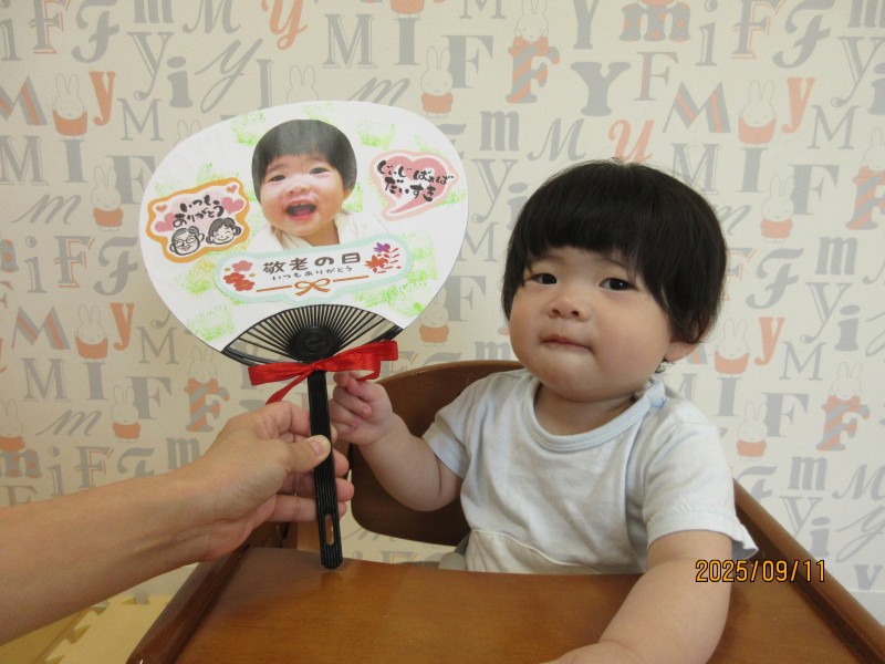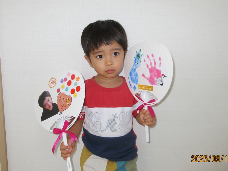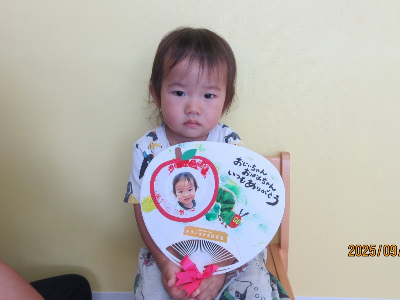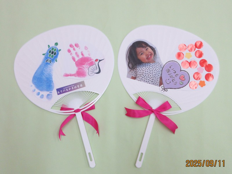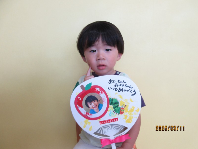 その他 日付:2025.09.16 👴👵おじいちゃんおばあちゃんいつもありがとう💕 おじいちゃんとおばあちゃんに「ありがとう!」を贈りました。🎁 0歳児ことり組。足形の亀さんが可愛いね。🐢 1歳児りす組。りんごの窓から可愛い笑顔が見えますよ。🍎 2歳児うさぎ組。素敵な花束も作ったよ。飾ってね。💐 👴👵いつも優しいおじいちゃんおばあちゃんが大好きな子ども達が、 「ありがとう!」を伝えたくて団扇を作りました。🎁 👦👧👶お孫さんの作品を飾って、癒されてくださいね。💕