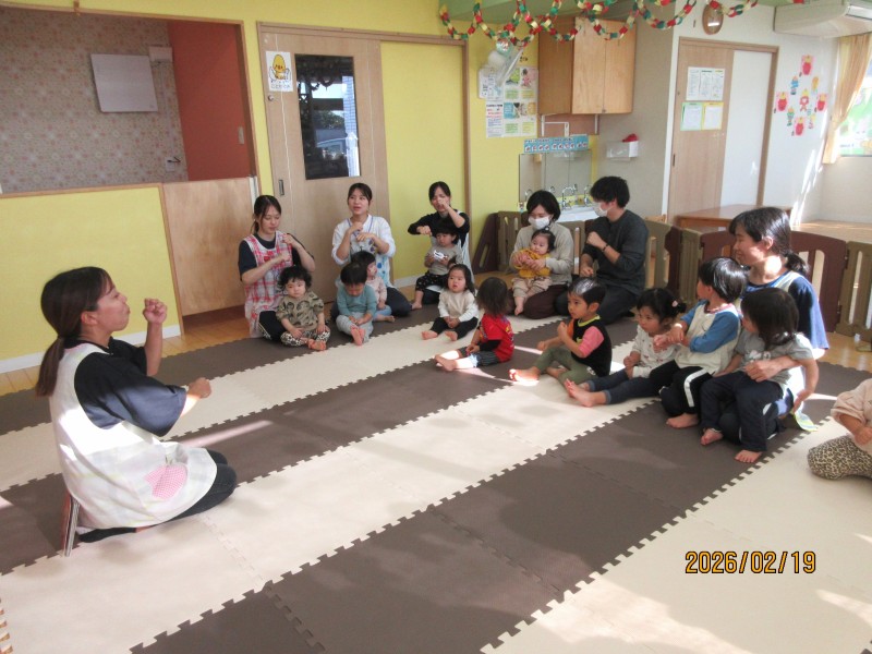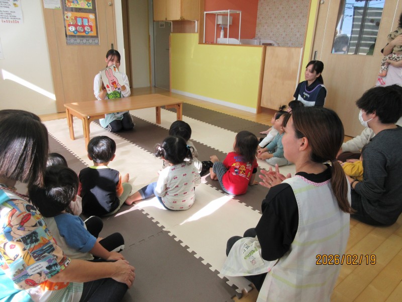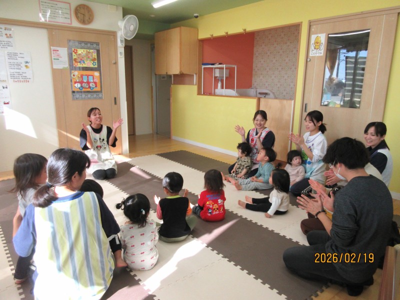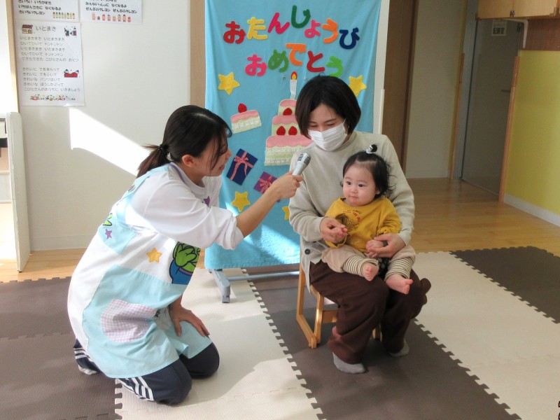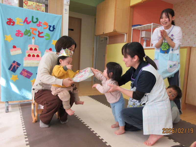 イベント 日付:2026.02.19 👑2月の誕生会と保育参加🎉 2月生まれの誕生会に、ご両親が参加しました。👨👩 みんなで歌を唄ったり、手遊びを楽しんだりしたよ。 お父さんが手遊び上手でノリノリなので、子ども達も注目。✨ インタビューに表情で答えるAさん。癒されます~。💕 お友達からプレゼントをもらってご機嫌。🎁 天使のような君を見るだけで、みんなが幸せになるんだ。👼💖 1歳のお誕生日おめでとう 絵本「動物の誕生日」のケーキが大好きなんだ。🎂 ペプサート「どんな色がすき」で盛り上がりました。🖍 ご両親の愛情に包まれて、すくすくと育ちますように。👪🎈