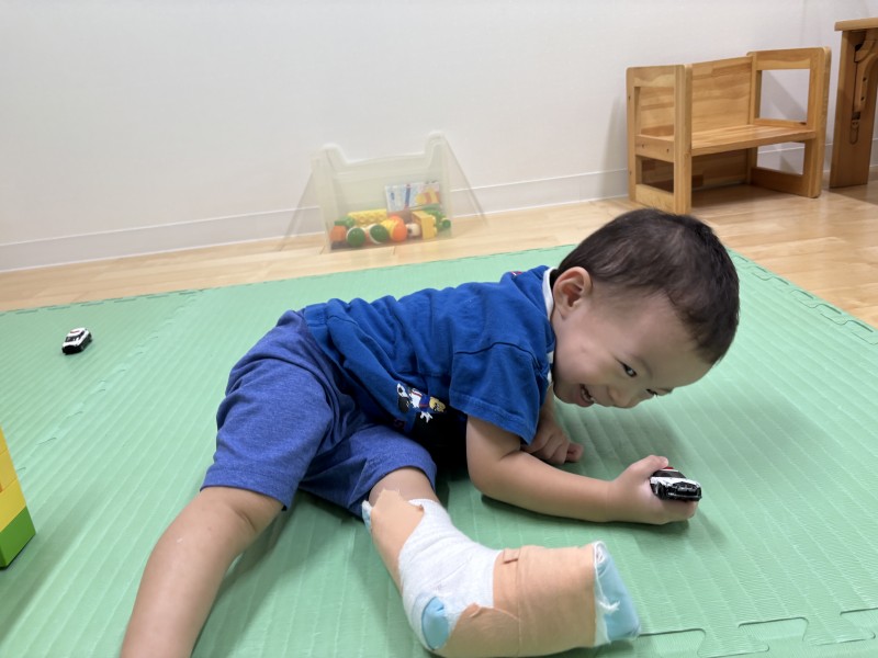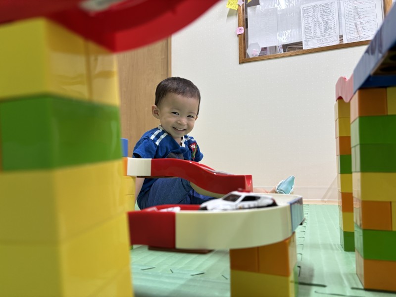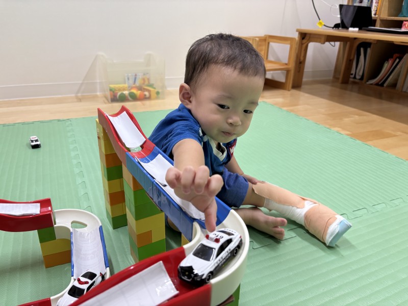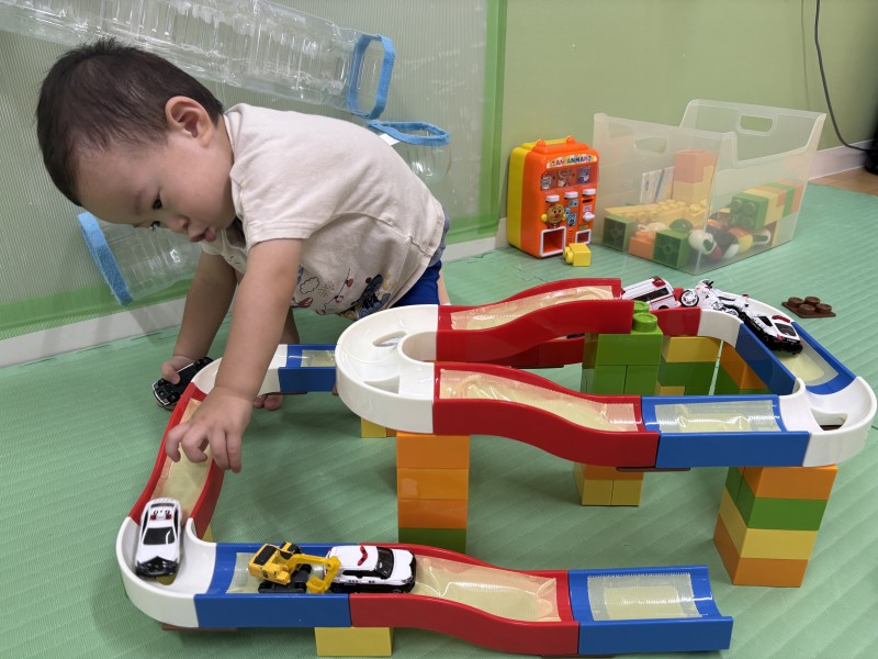 車が大好きでボールを転がして遊ぶブロックのコースターをレーンに見立てて遊んでいたので、保育者がトミカの車が走れるように改造🚗