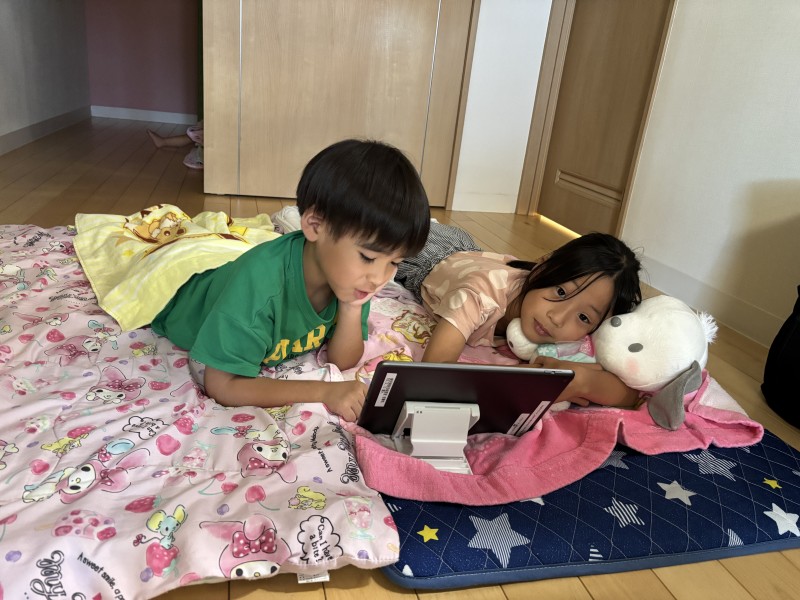 4歳の男の子はお昼寝よりも遊びたい様子でしたが、お姉ちゃんと一緒だと嬉しそうに休んでいました