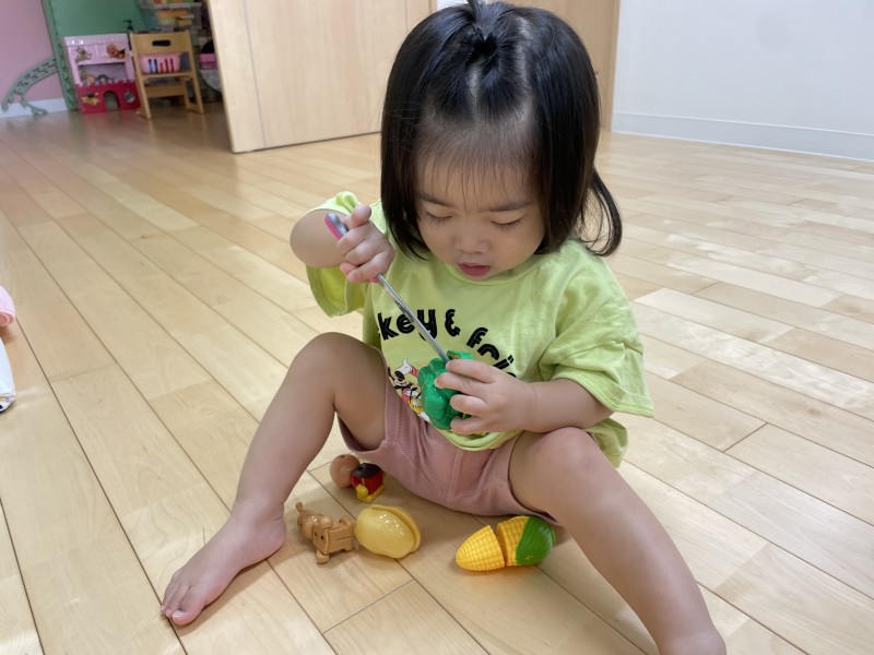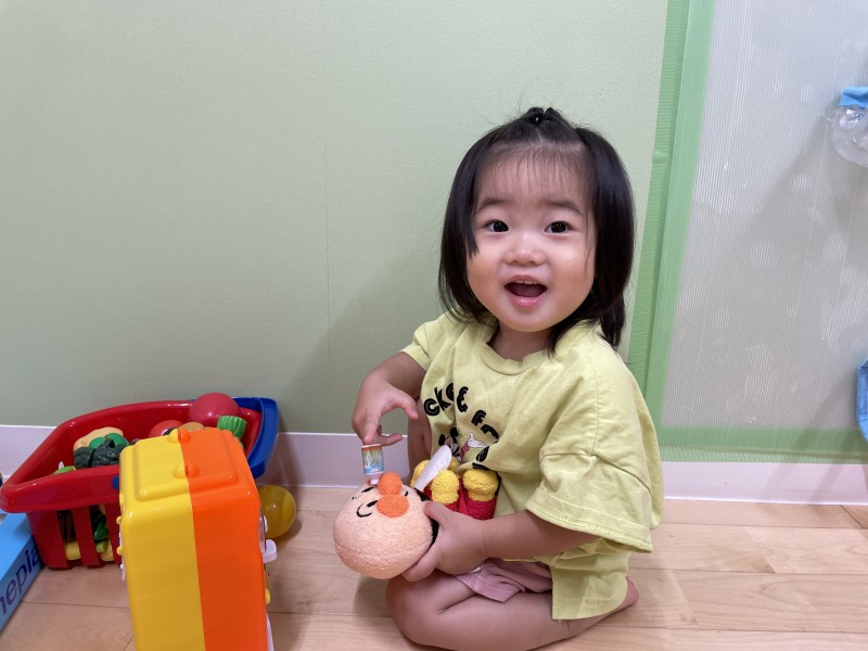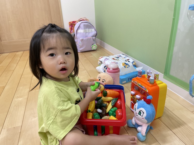 初めての利用でしたが、すぐに保育室に慣れ、お野菜を切ったり、アンパンマンの自動販売機からジュースを出してお人形に飲ませてあげた