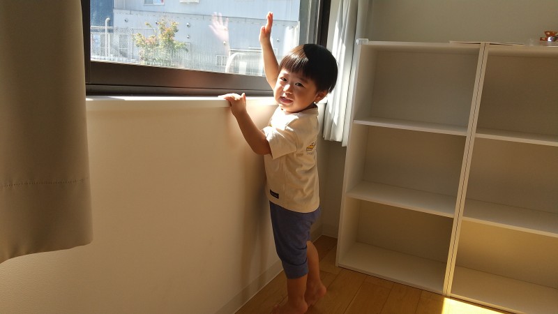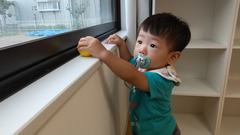 入室してお母さんと離れると泣いてしまいましたが、窓から外を眺め登園してくる子どもたちを見ているうちに泣き止み、窓をコンコンたたいたり手を振ったり、「あっ!」と鳥を見つけてニコニコ笑顔になりましたshine