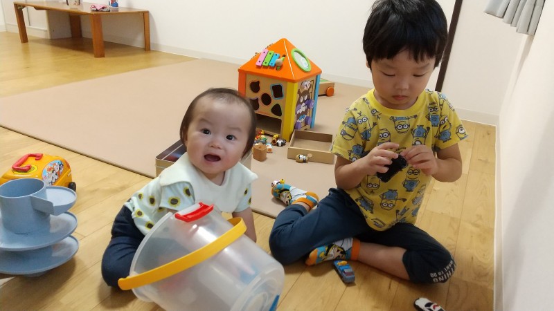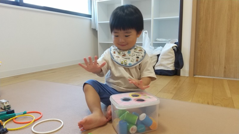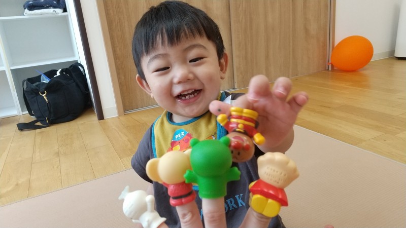 初めは泣いてしまいましたが、一緒に来たお兄ちゃんが遊んでいる様子をみると安心したのか、アンパンマンの知育玩具や指人形で遊び始めましたhappy01