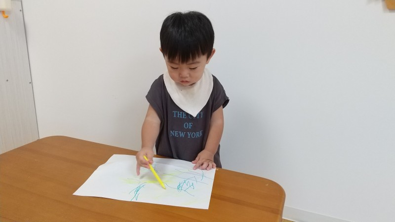 先生がペンで記入をしていると興味津々だったのでお絵描きもしてみました。ペンをじょうずに握り、自分で色を選び色の違いを楽しんで描いていましたshine