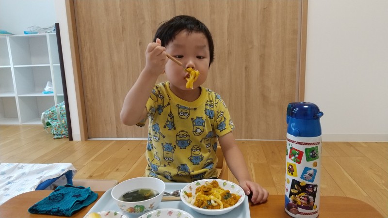 給食の麻婆かぼちゃうどんが気に入った様子でたくさん食べてくれましたshine
