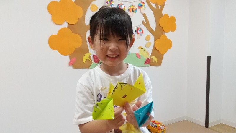 ぐっすりお昼寝した後は、ハサミやテープを使い折り紙でチューリップやカッパを製作しました!家族へのお土産にと大事にお持ち帰りしていましたよshine