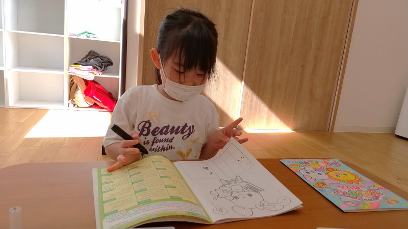 前回来た時にひらがなの練習をしたのを覚えていて、「ひらがな書きたい!」とやる気満々flair丁寧にひらがなのなぞり書きをしていましたhappy01