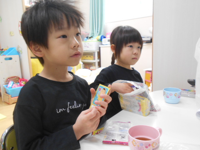 おやつは、自分たちで選んで持ってきたので「先生、見て見て不思議なガム持ってきたよ