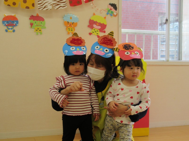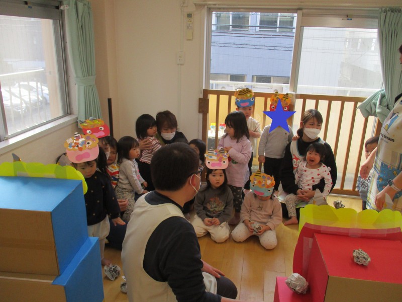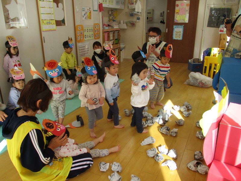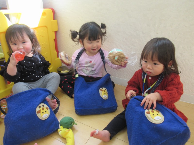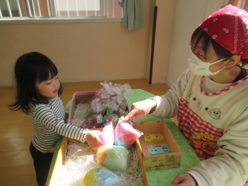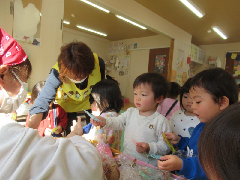 お客さん役のお友だちは、1人ひとりお金を持って買い物バッグを肩からさげてお店に向かい、店員さんのお友だちはエプロンと三角巾で身支度を整えて準備万端です![]()