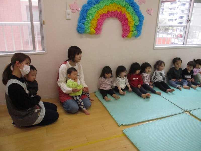 まだ緊張しているお友だちもいますが、先生と一緒にお返事しています✋