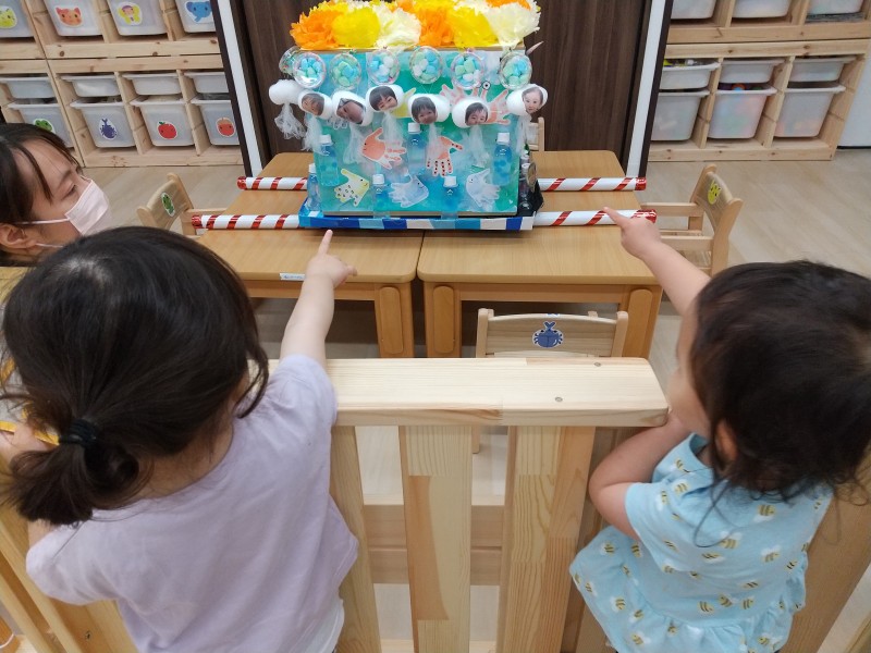 お迎え時に、ママやパパにチョコバナナや水ヨーヨーを喜んで見せている子どもの姿に、夏まつりを十分に楽しめたのかと思います。