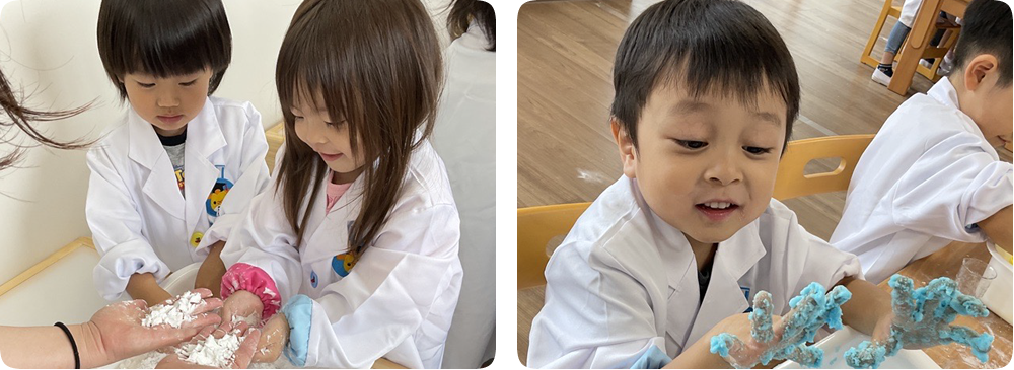 好奇心や探求心が刺激され、気づきが増えます。気づき(発見)に対し考えを巡らせ、先を予想し創意工夫をすることで、「物事を様々な視点から捉え解決する力」「答えがないものに自分なりの答えを見出す力」の土台が育まれます。また、友だちの様々な考えにふれる中で、異なる考えがあることに気が付き、考え合い、自分の考えをより良いものにするようになります。