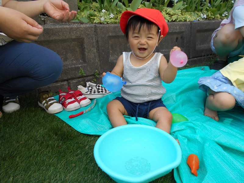 水風船を手に持ち、手や頬に近づけ冷たさや感触を喜んでいましたよ(^^♪