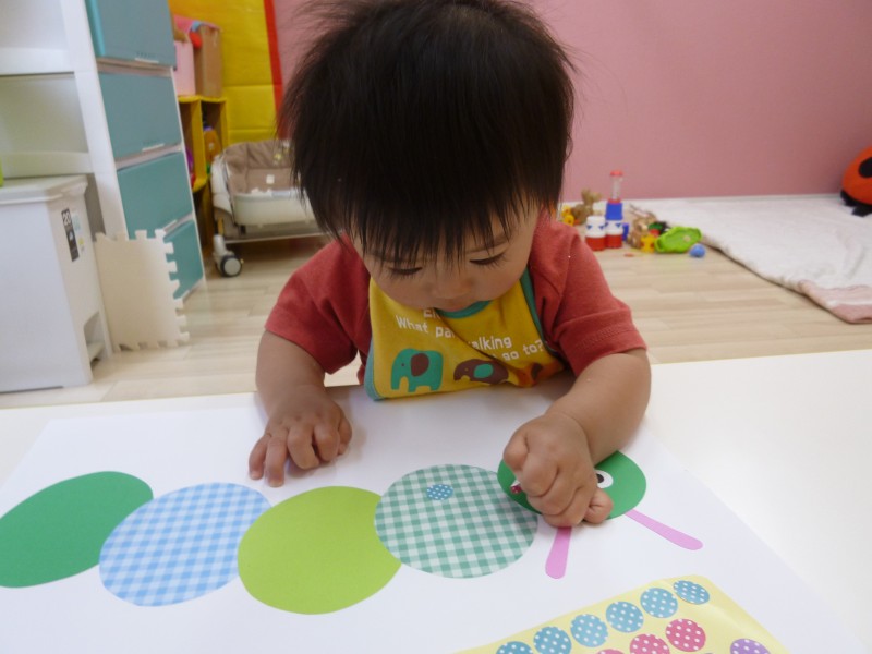 手にペタペタくっつき上手く貼れない場面も・・・保育士と一緒に手を添えながらシールを貼りました。
