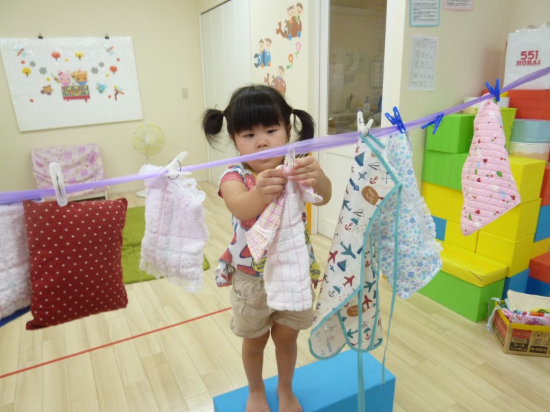 3つ目は洗濯ごっこをしました。洗濯バサミで上手に挟みハンカチやエプロンを干したり