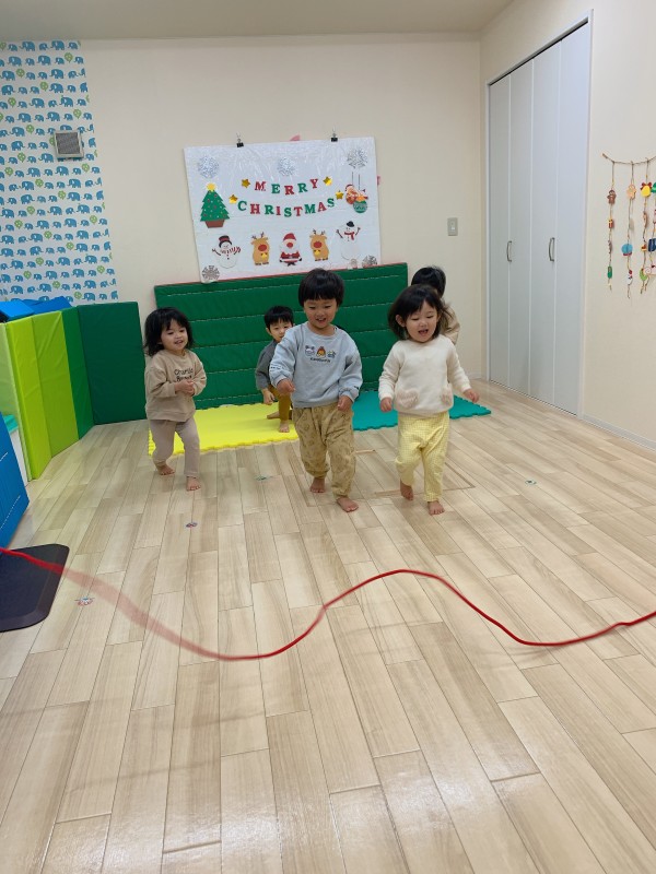 ロープ遊びでは、ロープに触らないように、上をジャンプしたり、下をくぐったりしています。