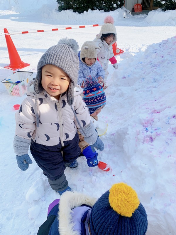 雪山に色水を掛けてからスコップで混ぜてなじませ、手袋やスノーコンビに絵の具を付かないように