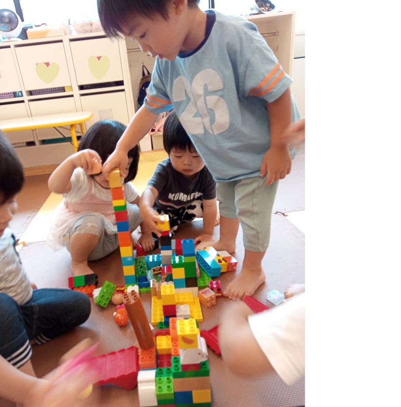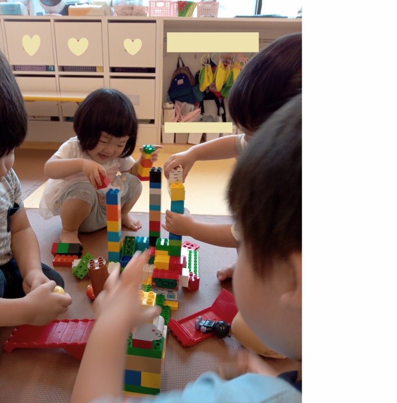 りす組さん(1歳児クラス)とうさぎ組さん(2歳児クラス)が一緒にブロック遊びをしている様子です。