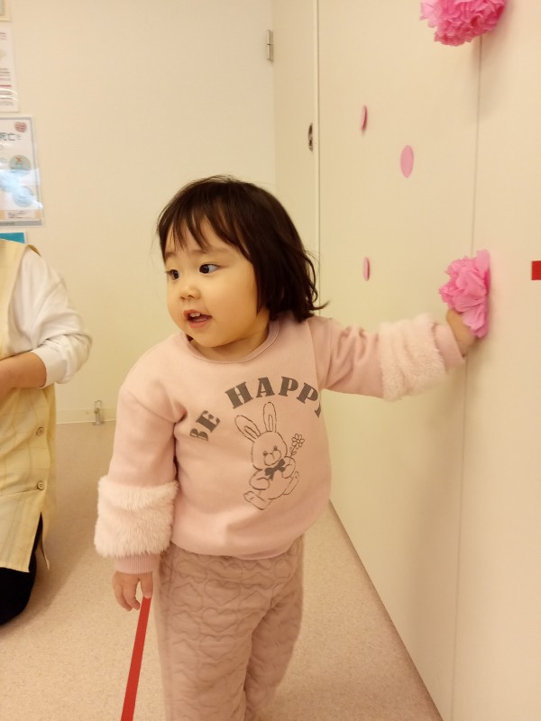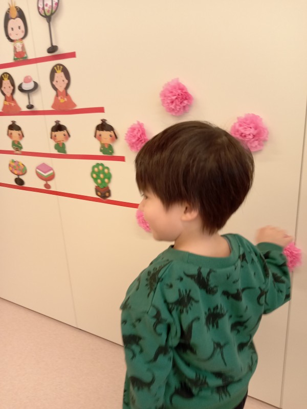 「会」では壁面に飾られたひな人形に今年は桃の花を子どもたちが添えてくれました。